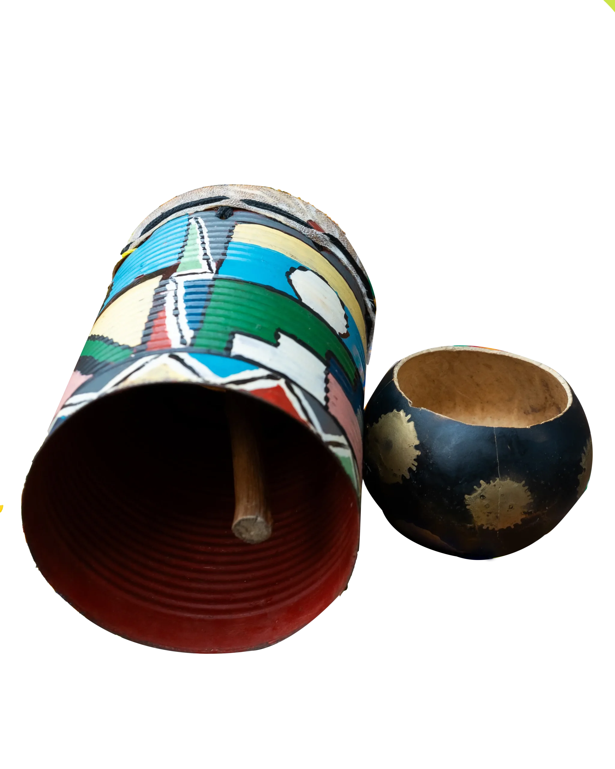 Immerse yourself in the rich percussive traditions of Africa with this authentic Ingungu drum and its beautiful calabash companion. Each piece in this set is a testament to cultural heritage and musical craftsmanship, perfect for musicians, collectors, and anyone seeking a unique rhythmic experience.